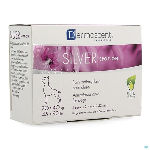 Prenez soin de la peau et du pelage de votre grand chien avec DERMOSCENT Silver Spot Chien 20-40 kg. Ce soin cutané innovant, présenté en 4 pipettes pratiques, est spécialement formulé pour les chiens de taille moyenne à grande, pesant entre 20 et 40 kg. Développé par les experts de Dermoscent, il apporte une solution ciblée pour soutenir la santé dermatologique, renforcer la barrière cutanée et améliorer la qualité du pelage de votre compagnon.