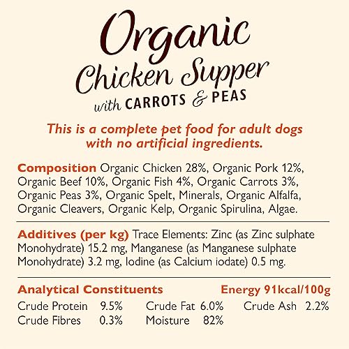 - Cette pâtée pour chien est également élaborée à partir d’ingrédients fraîchement préparés, notamment de l’agneau, du bœuf, du porc et du poulet fraîchement préparés, accompagnés de carottes et de pois, ainsi que de saines et savoureuses plantes et herbes aromatiques bio. Convient aux chiens de toute taille.