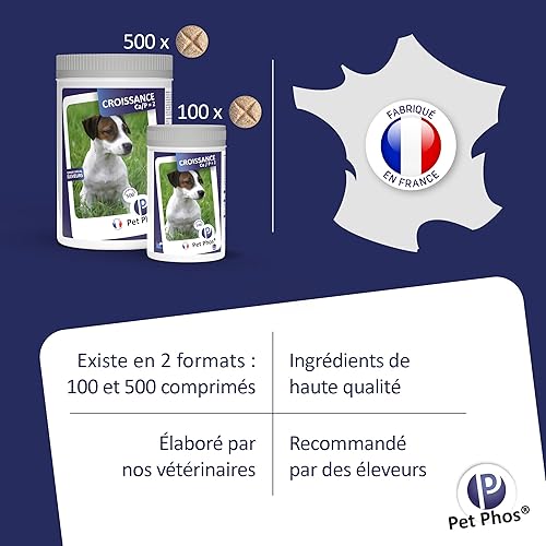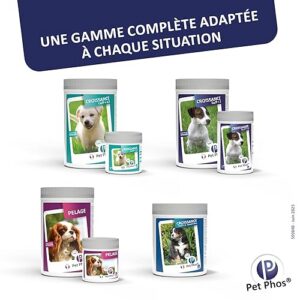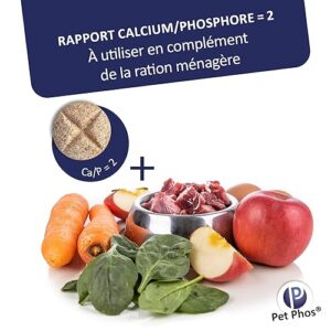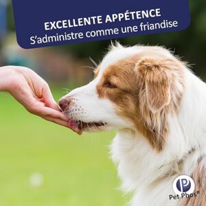Précautions : Prenez garde à ne pas laisser la boîte à la portée du chien, afin d’éviter une prise importante pouvant occasionner une augmentation trop brutale du taux de calcium de l’organisme. Mode d’emploi : L’excellente appétence de PET-PHOS permet en général une prise spontanée mais on peut également le donner mélangé à la ration quotidienne. Croissance : Croissance chiots petites races (adultes – 10 kg): 1 comprimé matin et soir pour 5 kg. Race Moyennes (adultes 10 à 25 kg): 1 comprimé matin et soir pour 5 kg. Chiots Grandes Races* (adultes + 25 kg): 3 comprimés matin et soir pour 10 kg. * Donner plutôt Pet-Phos Croissance Spécial Grand Chien. Lactation : Petites Races (adultes – 10 kg): 1 comprimé matin et soir pour 5 kg. Races Moyennes (adultes 10 à 25 kg): 1 comprimé matin et soir. Grandes Races* (adultes + 25 kg): 2 comprimés matin et soir pour 10 kg. * Donner plutôt Pet-Phos Croissance Spécial Grand Chien. A donner pendant toute la durée de la croissance et de la lactation. Animaux nourris avec une alimentation industrielle classique pour adultes: Donner Pet-Phos Ca/p=1,3 (poids adulte inférieur à 25 kg) ou Pet-Phos Croissance Spécial Grand Chien (poids adulte supérieur à 25 kg).