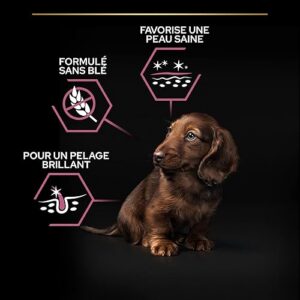 - Purina Pro Plan Sensitive Skin Small & Mini Puppy est formulé avec des sources de protéines sélectionnées pour les chiens à la peau sensible, sans ajout de blé* ; *Produit dans une usine où les céréales sont également transformées