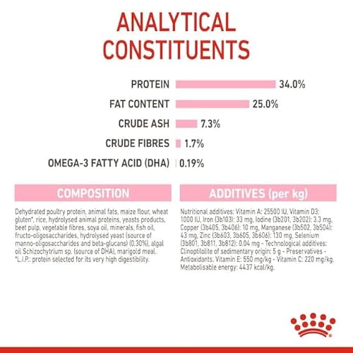 Composition: Protéines de volaille (déshydratées), graisses animales, maïs, gluten de blé*, riz, protéines animales hydrolysées, produits de la fermentation de levures, pulpe de betterave, cellulose, huile de soja, minéraux, huile de poisson, fructo-oligosaccharides, hydrolysat de levure (source de mannan-oligosaccharides et de bêta-glucanes) 0,30%, huile de Schizochytrium sp. (source de DHA), extrait de tagète. *L.I.P.: Protéines sélectionnées pour leur très haute digestibilité. Constituants analytiques: Protéines: 34,0% – Matières grasses: 25,0% – Cendres brutes: 7,3% – Fibres brutes: 1,7% – Vitamine E: 550 mg/kg – Vitamine C: 220 mg/kg – Acide gras oméga-3 (DHA): 0,19%. Valeur énergétique (ME): 4437 kcal/kg Additifs (par kg): Additifs nutritionnels: Vitamine A: 25500 UI, Vitamine D3: 1000 UI, Fer (3b103): 33 mg, Iode (3b201, 3b202): 3,3 mg, Cuivre (3b405, 3b406): 10 mg, Manganèse (3b502, 3b504): 43 mg, Zinc (3b603, 3b605, 3b606): 130 mg, Sélénium (3b801, 3b811, 3b812): 0,04 mg – Additifs technologiques: Clinoptilolite d’origine sédimentaire: 5 g – Conservateurs – Antioxydants.