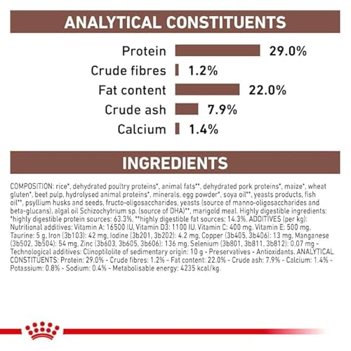 Composition : Riz*, protéines de volaille déshydratées*, graisse animale**, protéines de porc déshydratées*, maïs*, gluten de blé*, pulpe de betterave, protéines animales hydrolysées*, minéraux, poudre d’œufs*, huile de soja**, produits de levure, huile de poisson**, psyllium (cosse et graines), fructo-oligosaccharides, levures (source de mannane-oligosaccharides et de bêta-glucanes), huile d’algues Schizochytrium sp. (source de DHA)**, extrait de tagète. Ingrédients hautement digestibles : *sources de protéines hautement digestibles : 63,3%, **sources de matières grasses hautement digestibles : 14,3%. Additifs (par kg) : Additifs nutritionnels : Vitamine A : 16500 UI, Vitamine D3 : 1100 UI, Vitamine C : 400 mg, Vitamine E : 500 mg, Taurine : 5 g, Fer (3b103) : 42 mg, Iode (3b201, 3b202) : 4,2 mg, Cuivre (3b405, 3b406) : 13 mg, Manganèse (3b502, 3b504) : 54 mg, Zinc (3b603, 3b605, 3b606) : 136 mg, Sélénium (3b801, 3b811, 3b812) : 0,07 mg – Additifs technologiques : Clinoptilolite d’origine sédimentaire : 10 g – Conservateurs – Antioxydants. Constituants analytiques : Protéine : 29,0% – Fibres brutes : 1,2% – Matières grasses brutes : 22,0% – Cendres brutes : 7,9% – Calcium : 1,4% – Potassium : 0,8% – Sodium : 0,4% – Énergie métabolisable : 4235 kcal/kg
