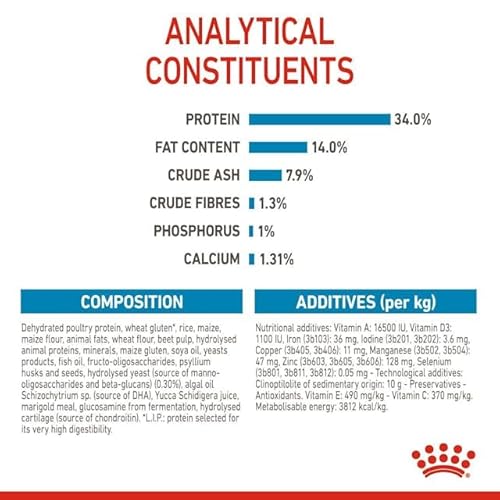 Protéines de volaille déshydratées, riz, isolat de protéines végétales*, maïs, graisses animales, protéines animales hydrolysées, pulpe de betterave, minéraux, huile de soja, levures, huile de poisson, fructooligo-saccharides, enveloppe de psyllium et graines, levure hydrolysée (source de mannan-oligo-saccharides), crustacés hydrolysés (source de glucosamine), extrait de glucosamine), extrait de calendula Source de lutéine ), cartilage hydrolysé (source de chondroïtine). Cendres brutes 7,6 %. Fibre brute : 1,4 %. Matières grasses huileuses brutes : 14 %. Humidité : 0 %. Protéines : 34 %.