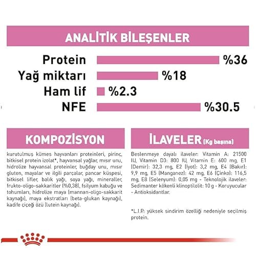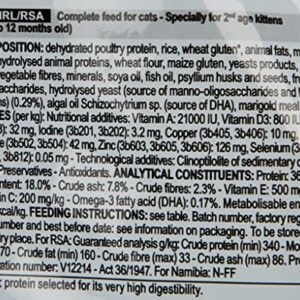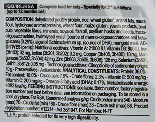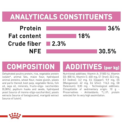 Viande de volaille déshydratée, riz, isolat de protéines végétales, graisses animales, maïs, gluten de maïs, protéines animales hydrolysées, fibres végétales, L-lysine, pulpe de betterave, minéraux, huile de poisson, levures, huile de soja, poudre d’œuf, phosphate de sodium, fructo-oligo-saccharides, extrait de levure, taurine, DL-méthionine, extrait de souci, L-carnitine.