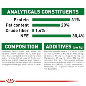 Viande de volaille déshydratée, farine de maïs, maïs, protéines de bœuf et de porc déshydratées, graisses animales, gluten de maïs, pulpe de betterave, protéines animales hydrolysées, huile de soja, minéraux, levure, huile de poisson, fructo-oligo-saccharides, poudre d’œuf, extrait de levure hydrolysé, souci