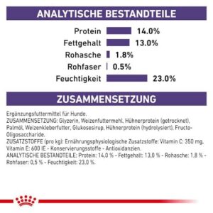 Composition : glycérine, farine de blé, protéines de poulet séchées, huile de palme, colle de blé, sirop de glucose, protéines de poulet hydrolysées, fructo-oligosaccharides