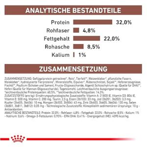 Constituants analytiques : Protéines : 32,0% – Matières grasses : 22,0% – Cendres brutes : 8,5% – Fibres brutes : 4,9% – EPA/DHA : 0,33% – Acides gras oméga-3 : 0,93% – Acides gras oméga-6 : 4,4% – Sodium : 0,6% – Potassium : 1%.