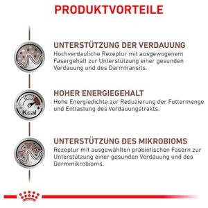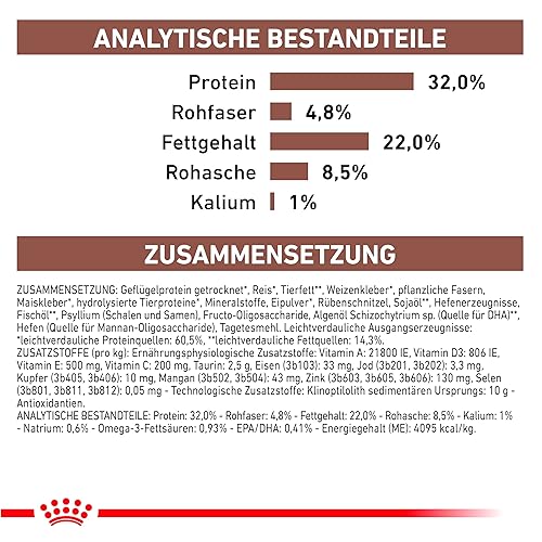 Composition : Protéine de volaille (séchée)**, riz**, graisse animale**, gluten de blé**, lignocellulose, gluten de maïs**, foie de volaille (hydrolysé), minéraux, œuf (séché)**, pulpe de betterave séchée, huile de poisson**, huile de soja**, produits de levure, psyllium (graines et enveloppes, source de mucilage), fructo-oligosaccharides (0,48%), hydrolysat de levure (source de mannan-oligosaccharides; 0,19%), farine de fleurs de Tagetes (source de lutéine). (**Ingrédients de base facilement digestibles.)