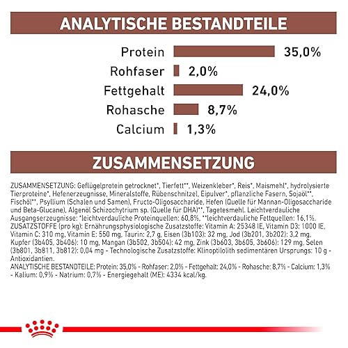 Composition : Protéines de volaille (déshydratées)**, graisse animale**, riz**, aliments au gluten de blé**, farine de fourrage de maïs**, foie de volaille (hydrolysé)**, produits à base de levure, substances minérales, huile de poisson**, pulpe de betterave séchée, œuf (déshydraté)**, lignocellulose, huile de soja**, psyllium (psyllium et son enveloppe, source d’agents gonflants), fructo-oligosaccharides (0,5%), hydrolysat de levure (0,2%, source de mannane-oligosaccharides et de bêta-glucanes), farine de fleurs de tagète (source de lutéine). (**Matières premières hautement digestibles.) Additifs (par kg)*** : Additifs nutritionnels : Vitamine A : 25500 UI, Vitamine D3 : 1000 UI, Fer (3b103) : 31 mg, Iode (3b201, 3b202) : 3,1 mg, Cuivre (3b405, 3b406) : 10 mg, Manganèse (3b502, 3b504) : 41 mg, Zinc (3b603, 3b605, 3b606) : 127 mg, Sélénium (3b801, 3b811, 3b812) : 0,04 mg – Additifs technologiques : clinoptilolite d’origine sédimentaire : 10 g – Conservateurs – Antioxydants. ***Les valeurs correspondent aux quantités ajoutées à la formule et non aux quantités naturellement présentes dans le produit. Constituants analytiques : Protéines : 35,0% – Matières grasses : 24.0% – Cendres brutes : 8,7% – Fibres brutes : 2,0% – Calcium : 1,25% – Potassium : 0,9% – Sodium : 0,7% – Acides gras oméga-6 : 5,2% – Acides gras oméga-3 : 1,2% .