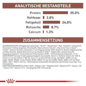 Ingrédients analytiques : Protéines : 35,0% – Teneur en graisses : 24,0% – Cendres brutes : 8,7% – Fibres brutes : 2,0% – Calcium : 1,25% – Potassium : 0,9% – Sodium : 0,7% – Acides gras oméga-6 : 5,2% – Acides gras oméga-3 : 1,2% .