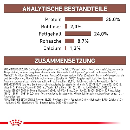 Composition : Protéines de volaille (déshydratées)**, graisse animale**, riz**, aliments au gluten de blé**, farine de fourrage de maïs**, foie de volaille (hydrolysé)**, produits à base de levure, substances minérales, huile de poisson**, pulpe de betterave séchée, œuf (déshydraté)**, lignocellulose, huile de soja**, psyllium (psyllium et son enveloppe, source d’agents gonflants), fructo-oligosaccharides (0,5%), hydrolysat de levure (0,2%, source de mannane-oligosaccharides et de bêta-glucanes), farine de fleurs de tagète (source de lutéine). (**Matières premières hautement digestibles.)