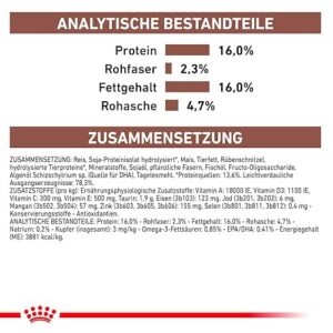 Composition : riz*, protéines de volaille séchées*, maïs*, graisse animale**, protéines animales hydrolysées*, poudre d’œuf*, produits de levure, pulpe de betterave, huile de soja**, fibres végétales, minéraux, huile de poisson**, psyllium (coquilles et graines), fructo-oligosaccharides, huile d’algues schizochytrium sp. (source de DHA)**, levures (source d’oligosaccharides de mannane), farine de test. Matières premières faciles à digérer : *Sources de protéines facilement digestibles : 67,4 %, **Sources de graisses facilement digestibles : 12,3 %
