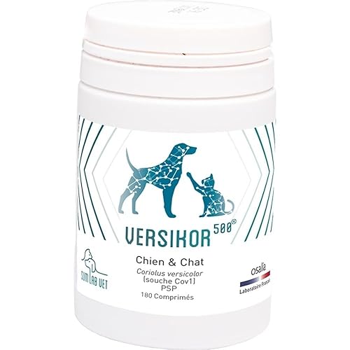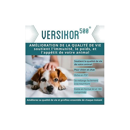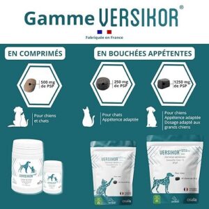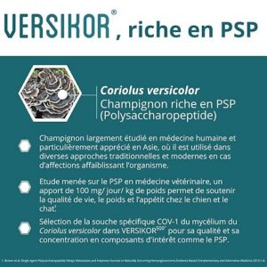 OSALIA – VERSIKOR 500 Versikor est un complément alimentaire diététique du laboratoire Osalia pour le soutien immunitaire des chiens et des chats. Versikor est un soutien immunitaire pour les chiens et les chats.Versikor 500 est riche en PSP (polysaccharopeptide).Comprimés hautement appétents et bi-sécables.Versikor ralentit le développement des cellules cancéreuses.Renforce l’immunité et les défenses organiques naturelles.Améliore la qualité de vie. Composition :Protéines brutes : 8,96 %Matières grasses : 1,16 %Cendres : 6,89 %Fibres brutes : 32,4 % A administrer par voie orale – Base 1 comprimé pour 5 kg Suivez les recommandations de votre vétérinaire.