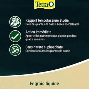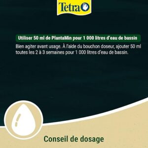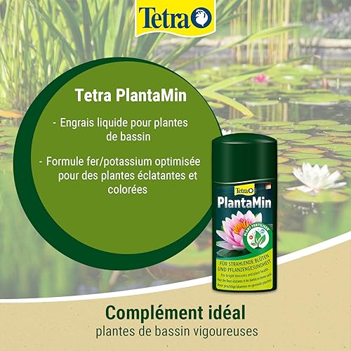 Description du produit Tetra Pond PlantaMin est un engrais liquide pour plantes aquatiques présentant un rapport fer/potassium étudié pour des plantes de bassin superbes aux couleurs éclatantes. Sa formule spéciale inclut également du manganèse et du bore, ainsi que d’autres oligo-éléments essentiels. Tetra Pond PlantaMin alimente les plantes de bassin de manière optimale en nutriments de haute qualité pendant quatre semaines : les feuilles, splendides, deviennent plus vertes, et les plantes bénéficient d’une croissance saine. Tetra Pond PlantaMin est exempt de phosphates et de nitrates et très simple à utiliser. Engrais liquide pour des plantes luxuriantes et des fleurs magnifiques. Il fournit des nutriments aux plantes pendant quatre semaines. C’est un mélange spécifiquement équilibré de fer, potassium et autres oligo-éléments essentiels. Il agit immédiatement grâce à l’absorption rapide des nutriments. Exempt de nitrates et de phosphates. Il convient à toutes les plantes de bassin Mode d’emploi Stocker dans un endroit frais et sec